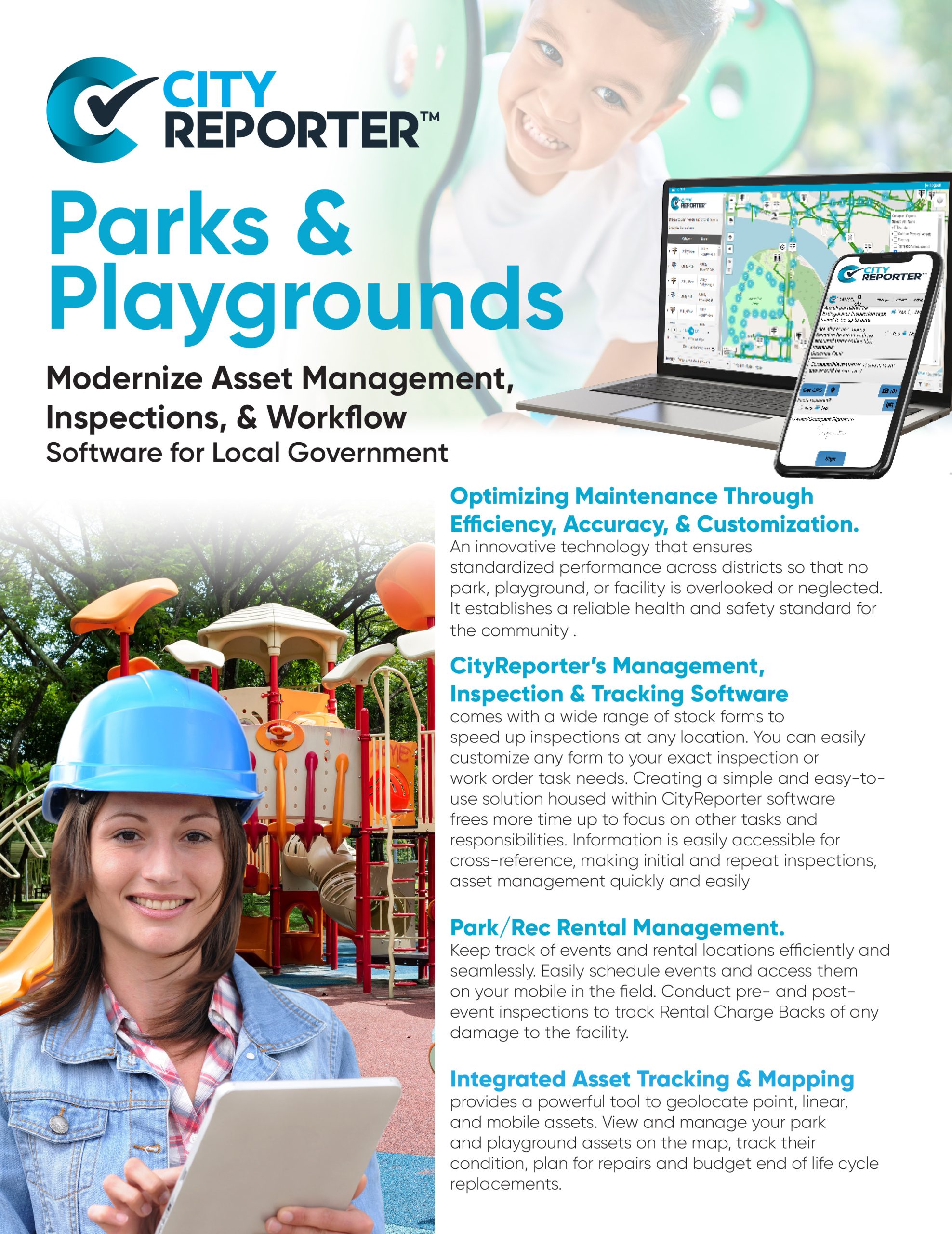Using a smartphone or tablet, the entire inspection, management, and maintenance process is much easier for crews. This makes for safer parks and happier communities.