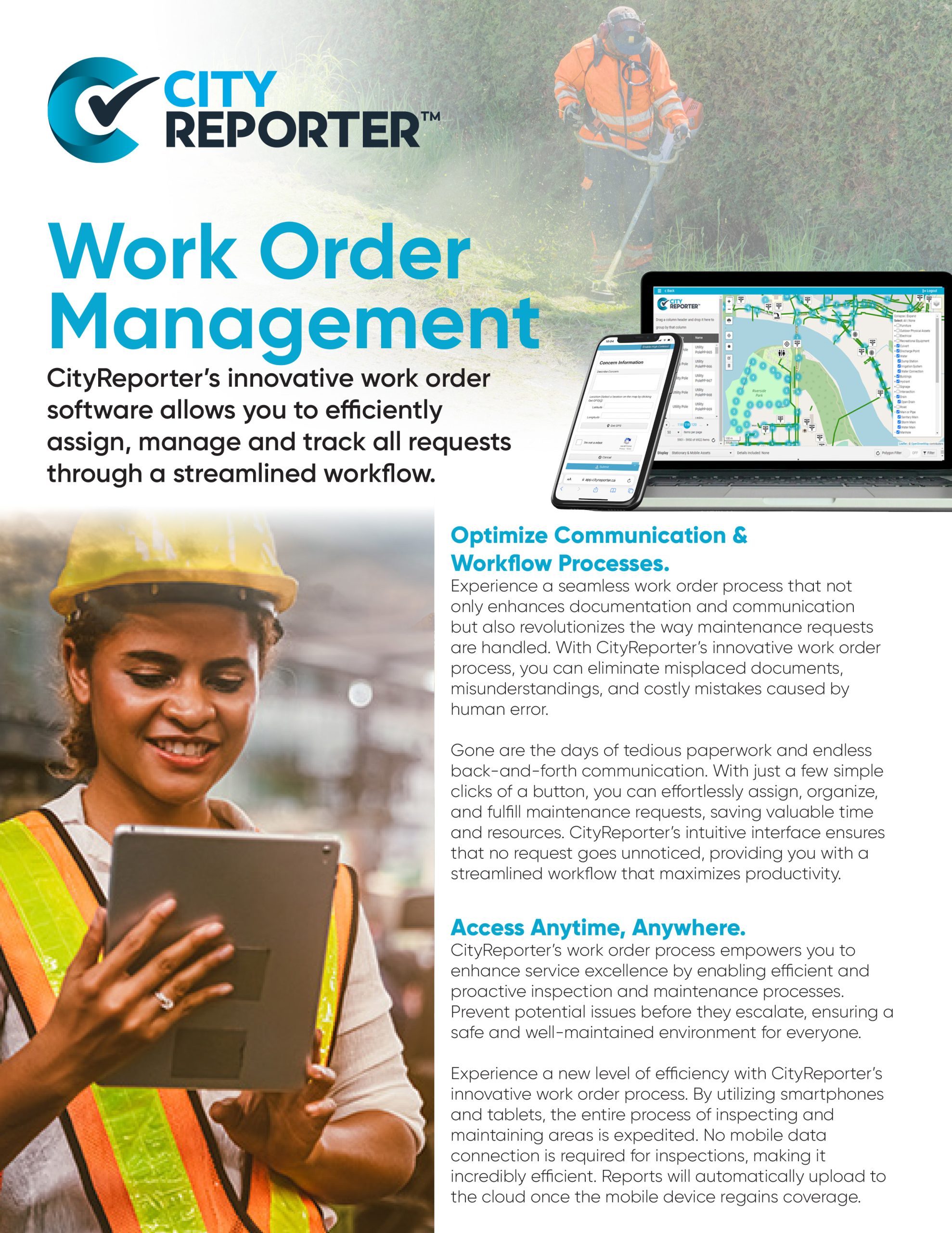 Eliminate the days of tedious paperwork and endless back-and-forth communication. With just a few simple clicks of a button, you can effortlessly assign, organize, and fulfill maintenance requests, saving valuable time and resources. CityReporter’s intuitive interface ensures that no request goes unnoticed, providing you with a streamlined workflow that maximizes productivity.